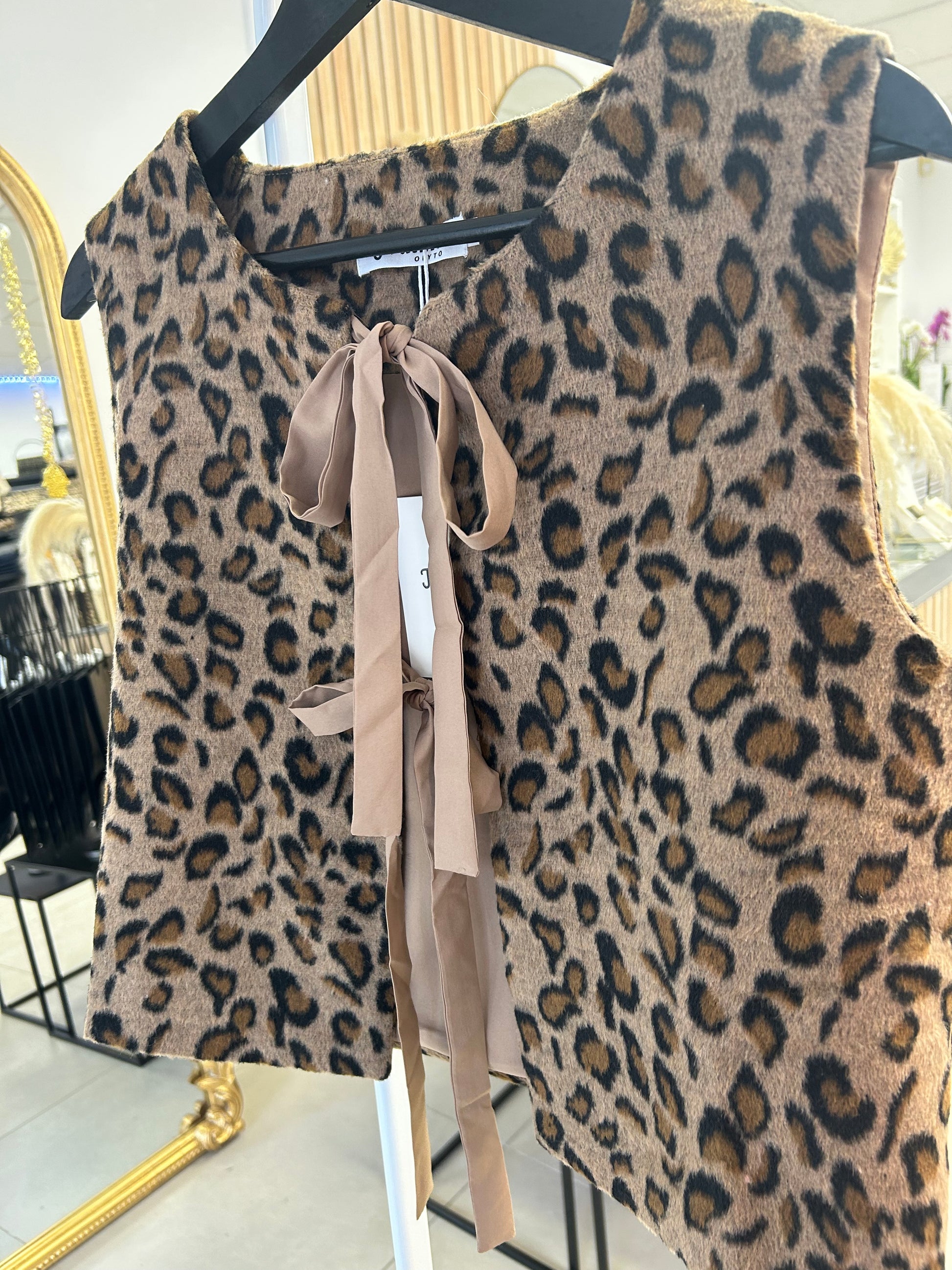 Gilet touché très doux imprimé léopard fermeture sur le devant avec noeud de couleur marrons.