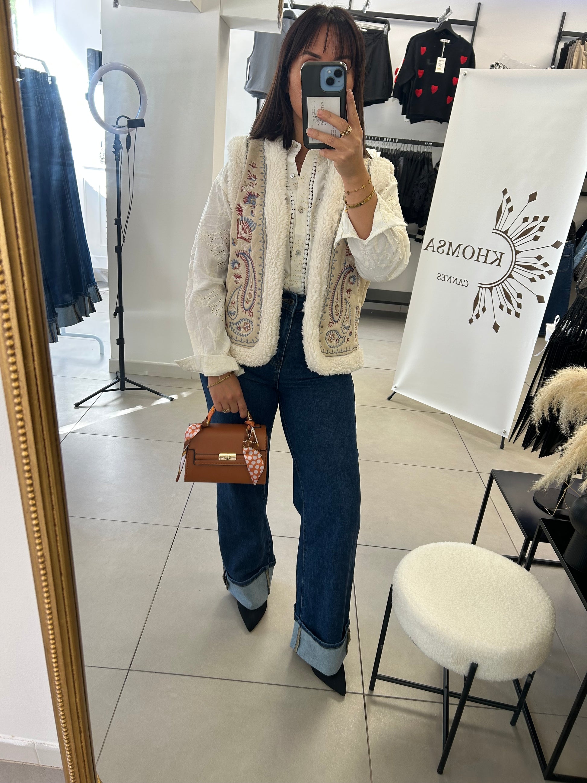 Denim coupe Wide leg taille haute avec revers en bas de la jambe. Fermeture sur le devant bouton et fermeture éclaire.