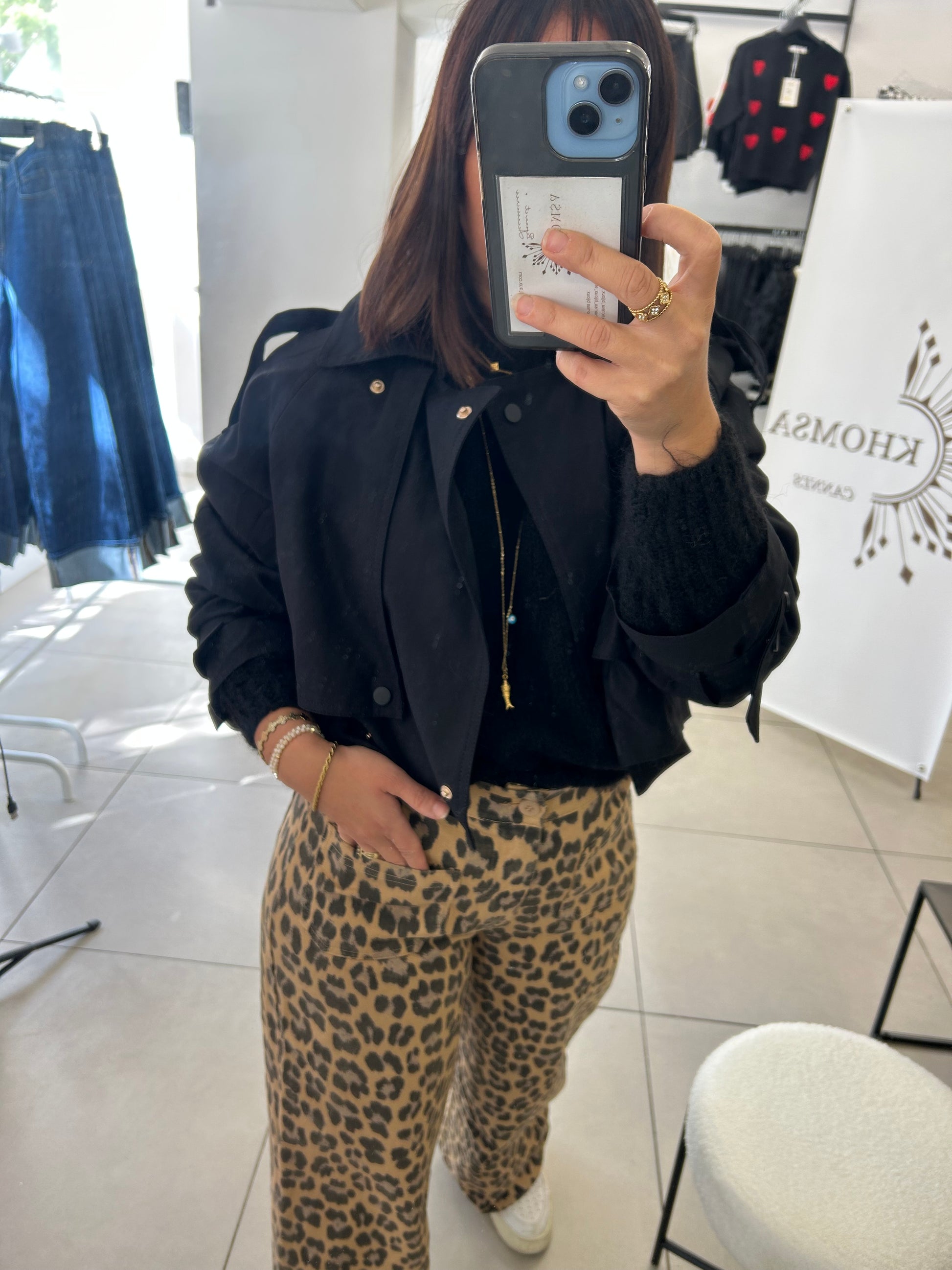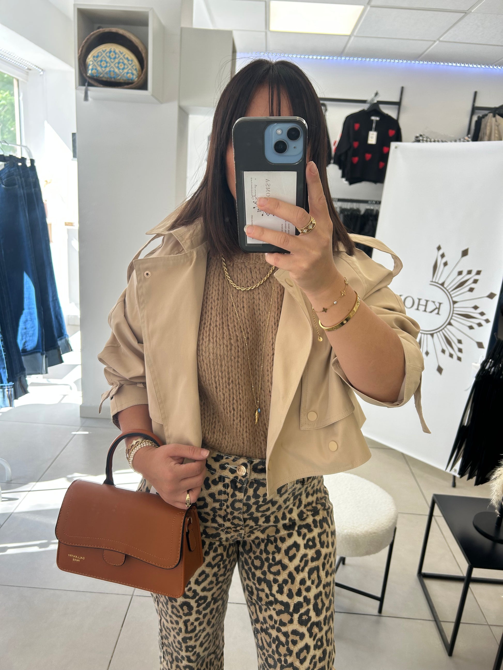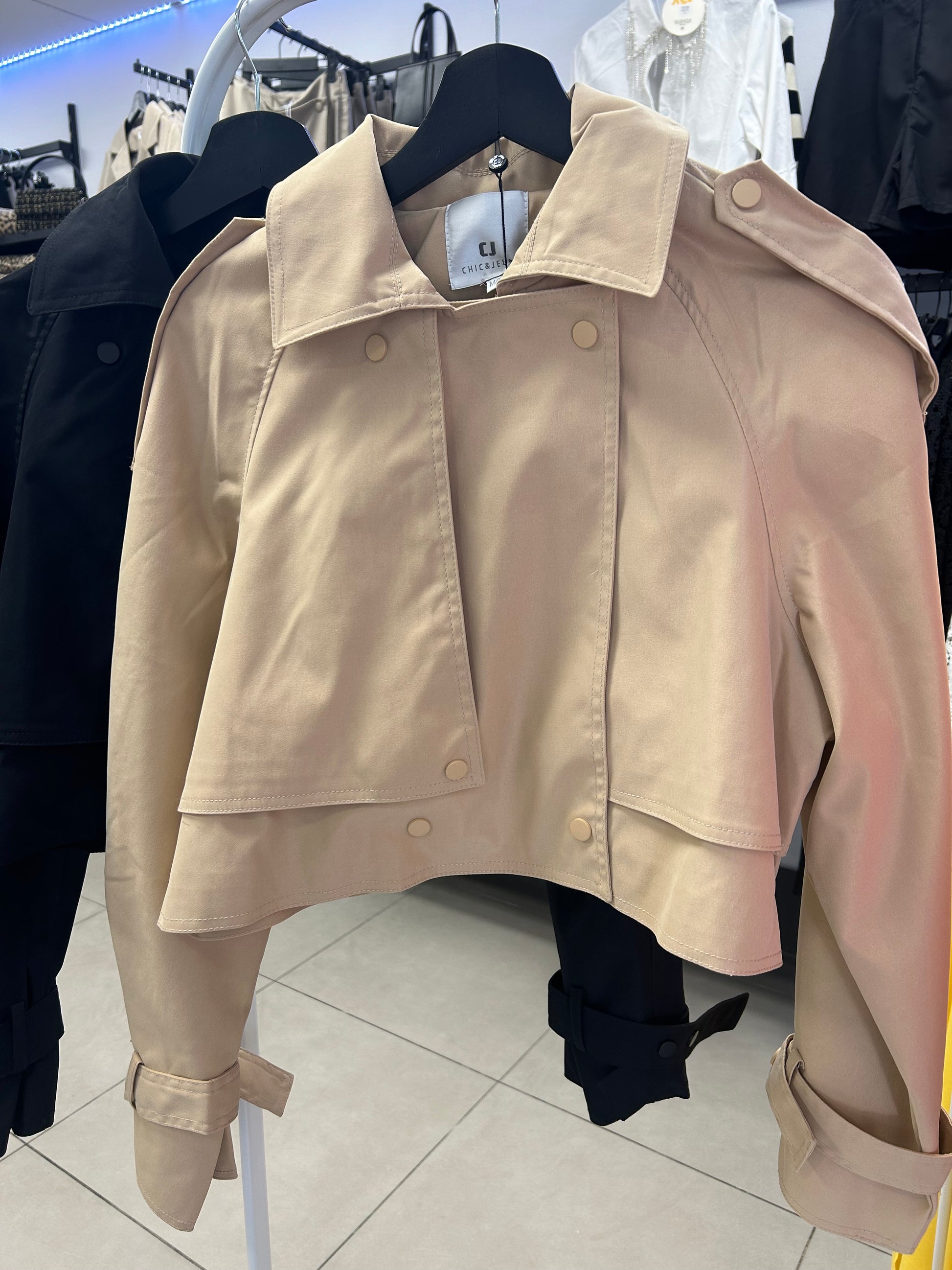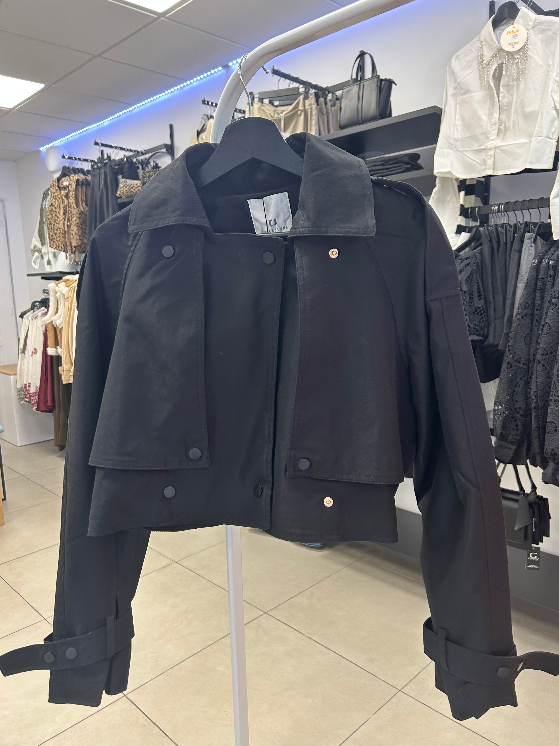 Blouson style trench court à col à revers et manches longues avec passants et boucles métalliques. Fermeture croisée par boutons sur le devant. Bouton à pression